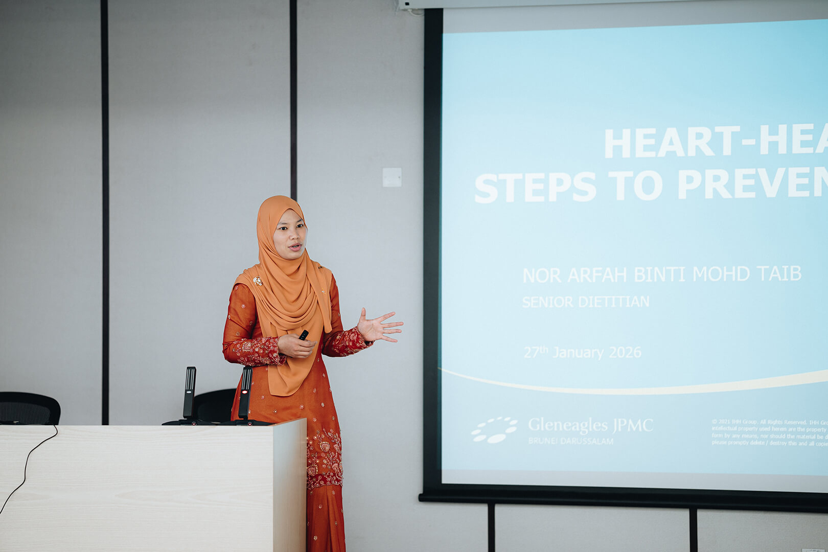 The heart health session featured two invited speakers who shared insights on cardiovascular health and preventive care. The first talk was delivered by YM Pg. Dr. Md. Nadzir bin Pg. Mohd. Juanda, Deputy Director of Cardiac Surgery and Consultant Cardiothoracic Surgeon at Gleneagles JPMC, with the topic “Powering the Plant Starts with Healthy Hearts.” The talk emphasised the importance of heart health in supporting personal well-being, workplace safety, and sustained work performance. Dr. Nadzir also highlighted common cardiovascular risk factors, early warning signs of heart disease, and practical preventive measures that can be adopted both in the workplace and at home to promote long-term heart health.